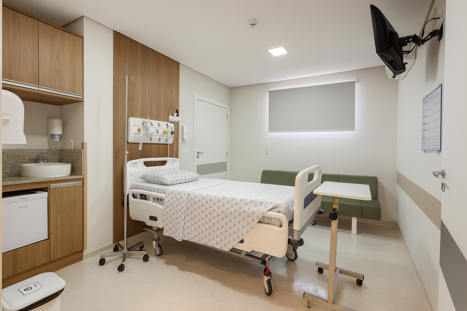 Quartos aconchegantes, climatizados e pensados para o bem-estar do paciente e acompanhante.